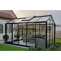 Een duurzame, zwarte aluminium tuinkas met 4 mm veiligheidsglas in zijwanden en dak, zelfdragende al