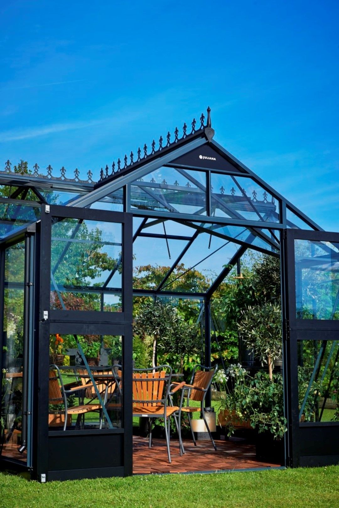 De Orangery 152 vormt een T-model kas waarin eigentijds design en een solide constructie worden gecombineerd. Het geraamte van de oranjerie bestaat uit een aluminium constructie die zowel in blank als antracietgrijs gecoat leverbaar is. Andere frameonderdelen (deur, ramen, goten en de regenafvoer) worden standaard in zwarte kleur geleverd. Dit resulteert in een opvallend contrast.