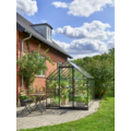Ruime zwarte tuinkas met stevig aluminium Qube‑profiel en 3 mm veiligheidsglas, voorzien van dubbele schuifdeur en vier dakramen voor uitstekende ventilatie en licht . ideaal voor groenten, kruiden en bloemen.