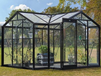 Een duurzame, zwarte aluminium tuinkas met 4 mm veiligheidsglas in zijwanden en dak, zelfdragende al